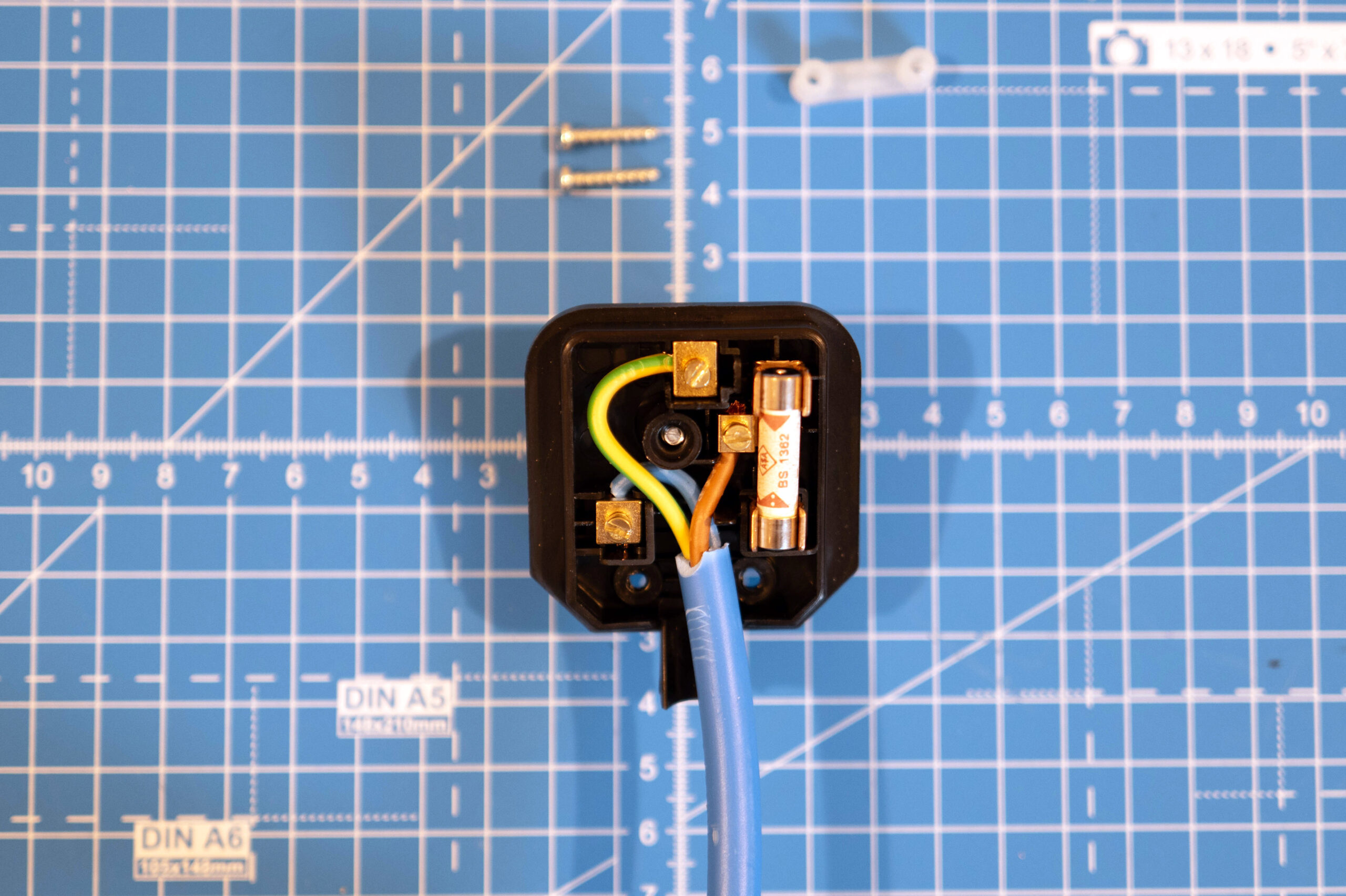 Get your flex cable for the plug and strip the outer sheath to reveal your live (brown), neutral (blue) and earth (yellow/green) wires.